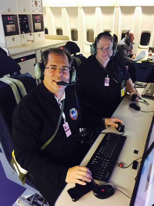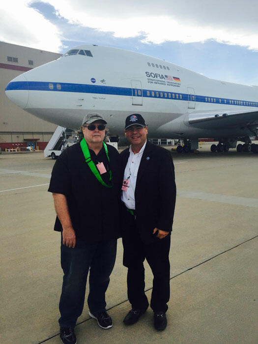 Steve Kates "Dr. Sky" (right) and C2C Producer Tom Danheiser (left) in front of NASA’s Airborne Observatory SOFIA Aboard SOFIA