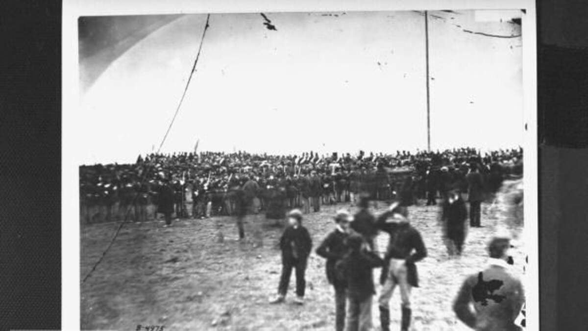 "Andrew D. Basiago, 10, at Gettysburg, PA, on November 19, 1863, after being sent there from 1972 by DARPA's Project Pegasus via a "plasma confinement chamber" in East Hanover, NJ. Andy is the boy standing to the left in the foreground of the image. He is wearing the large shoes that were given to him by Gettysburg cobbler John Burns after he walked into Gettysburg barefoot and shivering in the brisk autumn air after arriving from the future. Andy says that this image was taken shortly after President Lincoln arrived on the dais to deliver the Gettysburg Address."