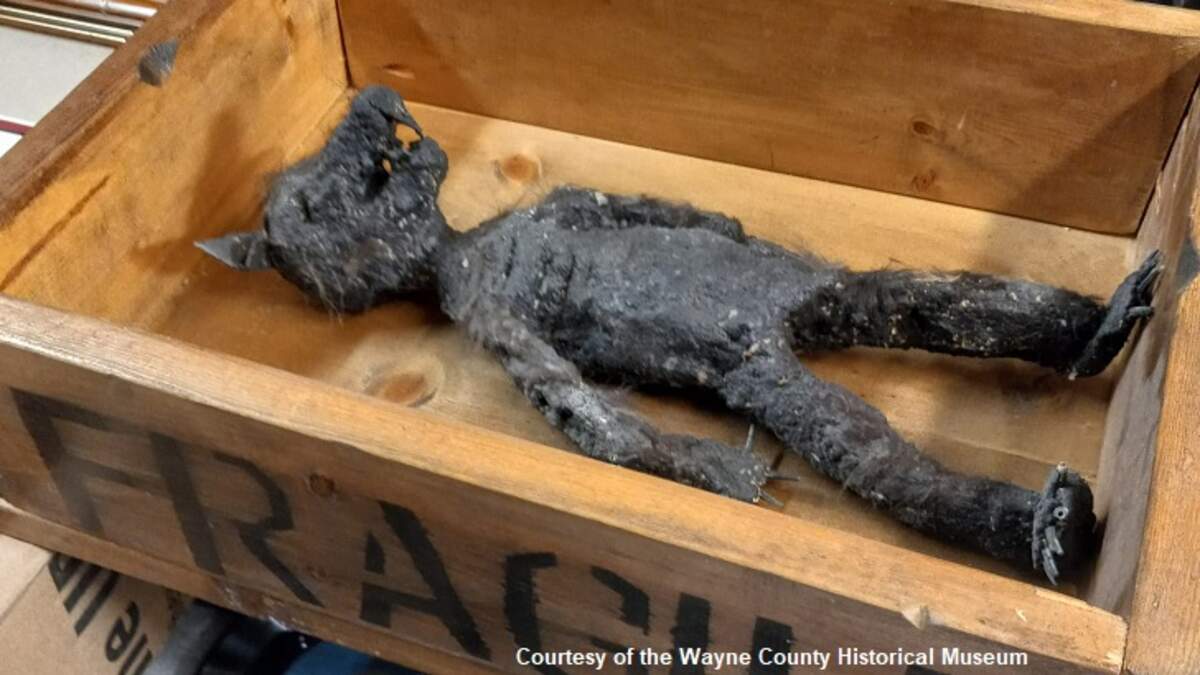 A museum in Indiana is trying to get to the bottom of a strange mystery that appeared on their doorstep in the form of a bizarre figurine that they have dubbed the 'Richmond Rat Boy.' Showcasing the oddity on social media earlier this week, the Wayne County Historical Museum in the community of Richmond explained that they discovered the peculiar piece on Monday morning in a wooden box addressed to the site and delivered to their back gate. The creepy figurine (seen in more detail below) resembles some kind of cryptid, with a creature's head atop a small humanoid body stretched out inside the container, which is marked 'fragile.'
