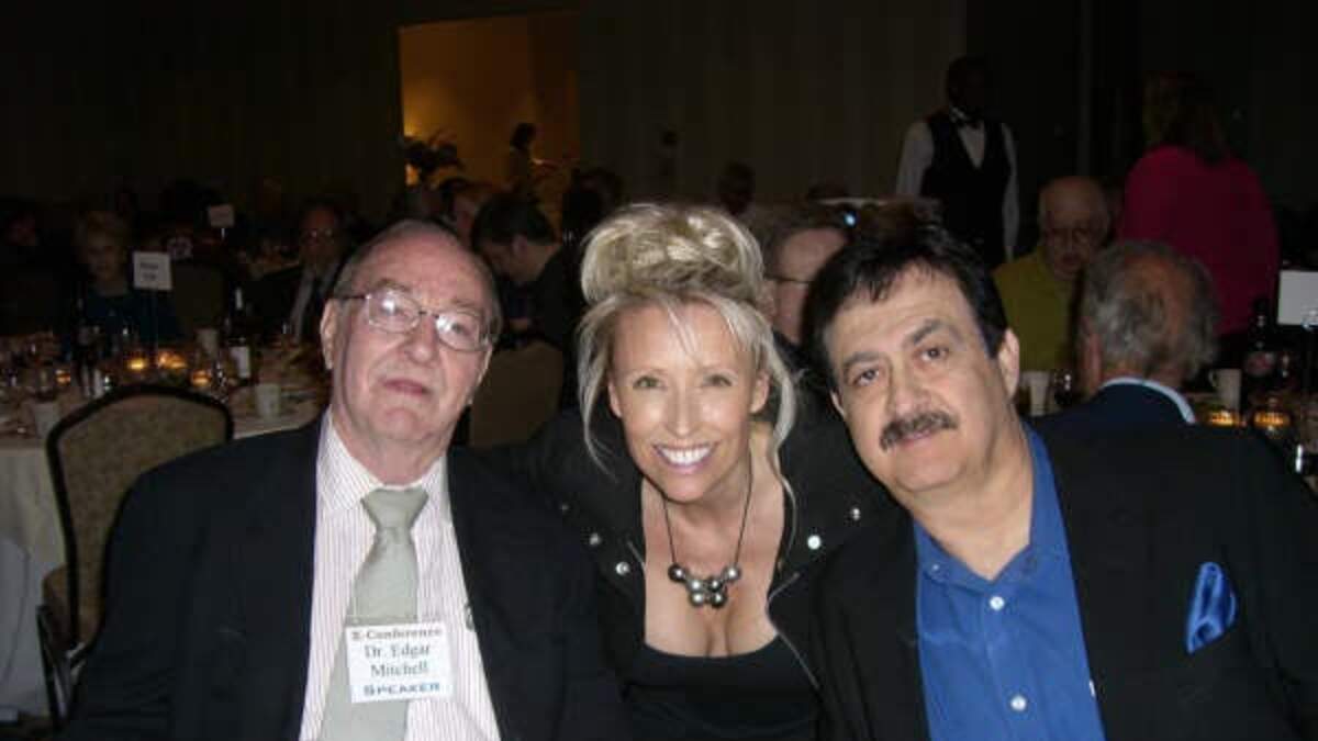 Pictured at the 2009 X-Conference, Apollo 14 astronaut Edgar Mitchell, producer Tonia Madenford, and George Noory.