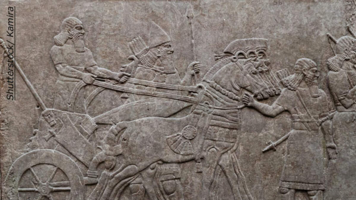 Pictured: Relief of ancient Assyrian warriors in a horse drawn chariot.