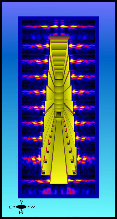 8) Grand Gallery Acoustic Spectra -- Robert Vawter’s spectra with Grand Gallery illustrating corbels responding at different frequencies to sound input. Note: This graphic is for visual effect and is not intended to suggest that the acoustic spectra gathered inside the gallery exists within the limestone wall blocks.