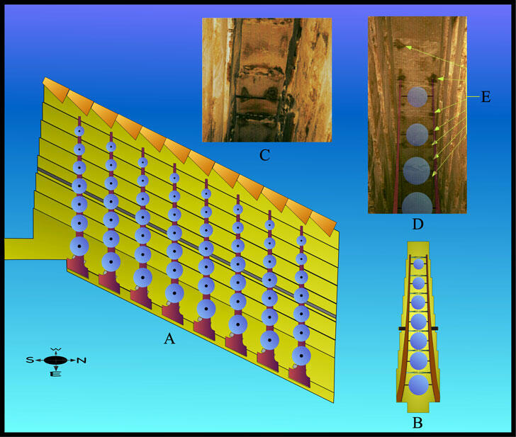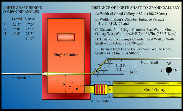 D: The Grand Gallery illustrating the correlation between the pairs of scorch marks (E) and the resonator frames that were first discussed in The Giza Power Plant, 13 years earlier.