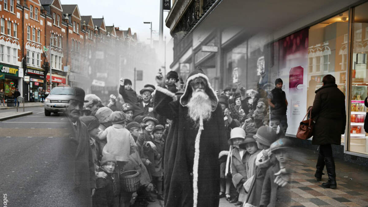 Photographer Peter Macdiarmid has revisited historic Christmas photographs of London and digitally merged them with present day images of the same areas. This picture shows Clapham Junction in 1926 and 2014. View more composites here.