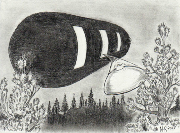 Noe Torres sent sent us illustrations from his book, co-written with Ruben Uriarte, Aliens in the Forest: The Cisco Grove UFO Encounter, to accompany their appearance on the 12/26/11 show. The 1964 incident was reported by then 26-year-old Donald Shrum, who encountered robotic beings at a remote location in the Tahoe National Forest in California (Google Map coordinates).