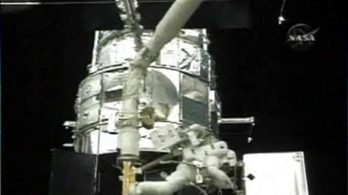 Two spacewalking astronauts, John Grunsfeld and Drew Feustel, spent six and a half hours on Saturday installing a new high-tech instrument on Hubble as well as performing complex repairs to the space telescope's broken planetary camera. The repair work is considered the most difficult ever attempted in orbit, according to NASA. Hubble will be released from Atlantis on Tuesday after additional maintenance, and is expected to function for another five to 10 years. Further info and video available at MSNBC.