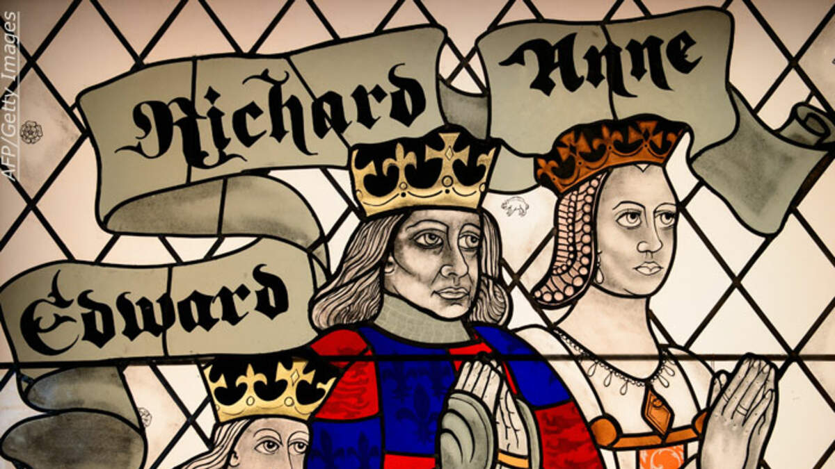 Pictured (click on image to enlarge): A stained glass window depicting King Richard III and his wife and son displayed in the new visitor's center on the site where his remains were discovered, in Leicester, central England, on July 24, 2014.