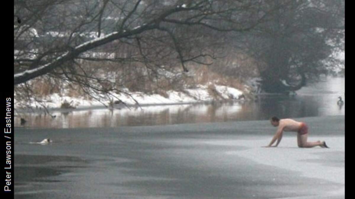 Dog walkers in Dedham, England were stunned to see a man taking drastic measures to rescue his wayward pet that had fallen into an ice-covered river. The unknown hero managed to save the dog, by ditching his clothes and crawling across the ice, but also fell into the frigid waters during the impromptu rescue mission. Fortunately, the man and his dog made it back to shore safe and sound, albeit soaking wet. More on the story at The Telegraph.