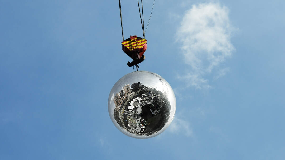 Videos posted to social media this past week show massive silver orbs crashing through the streets of central London. The giant shiny spheres were part of an art installation called "Four World Set" by artist Tom Shannon. High winds from a storm swept the art installation away. The piece, composed of a stack of four chrome-colored spheres, was commissioned by electronic music duo Mount Kimbie and had just been unveiled the day before. On Instagram, Kai Campos of Mount Kimbie posted, "I'm absolutely gutted that more people won't get to see it this week."