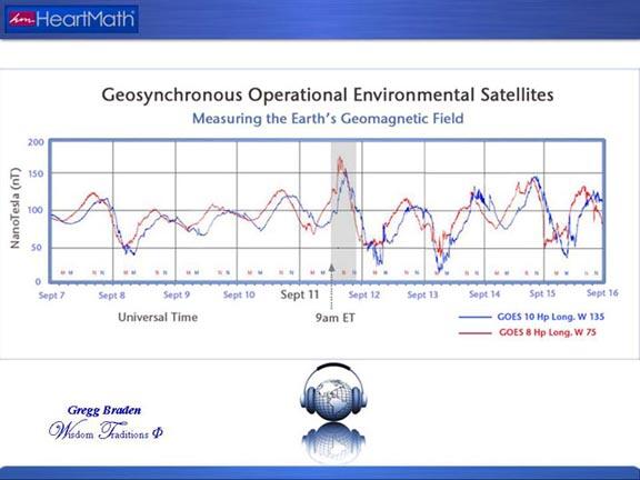 Graph showing the spike in Earths geomagnetic field on September 11, 2001 as measured from the GOES Satellites.