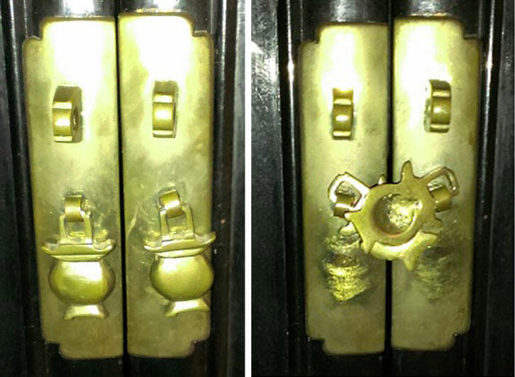 Cabinet with normal door handles (left) and spirit-tampered crossed handles (right)