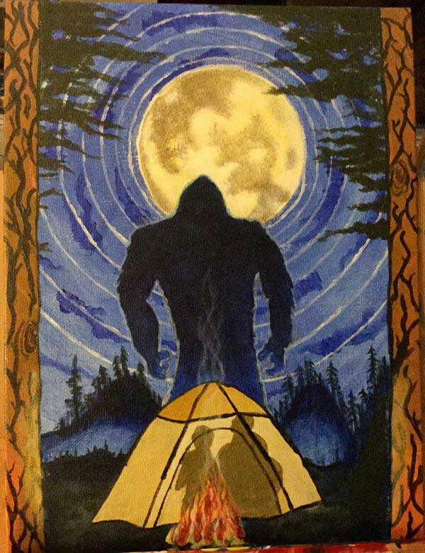 "Camping in Bigfoot Country" acrylic painting by Miranda Gehrke