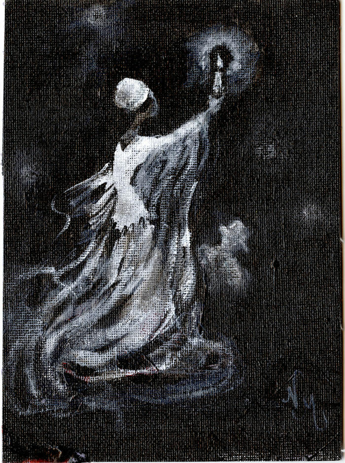 "Woman in White" acrylic on canvas board, 3" by 5"