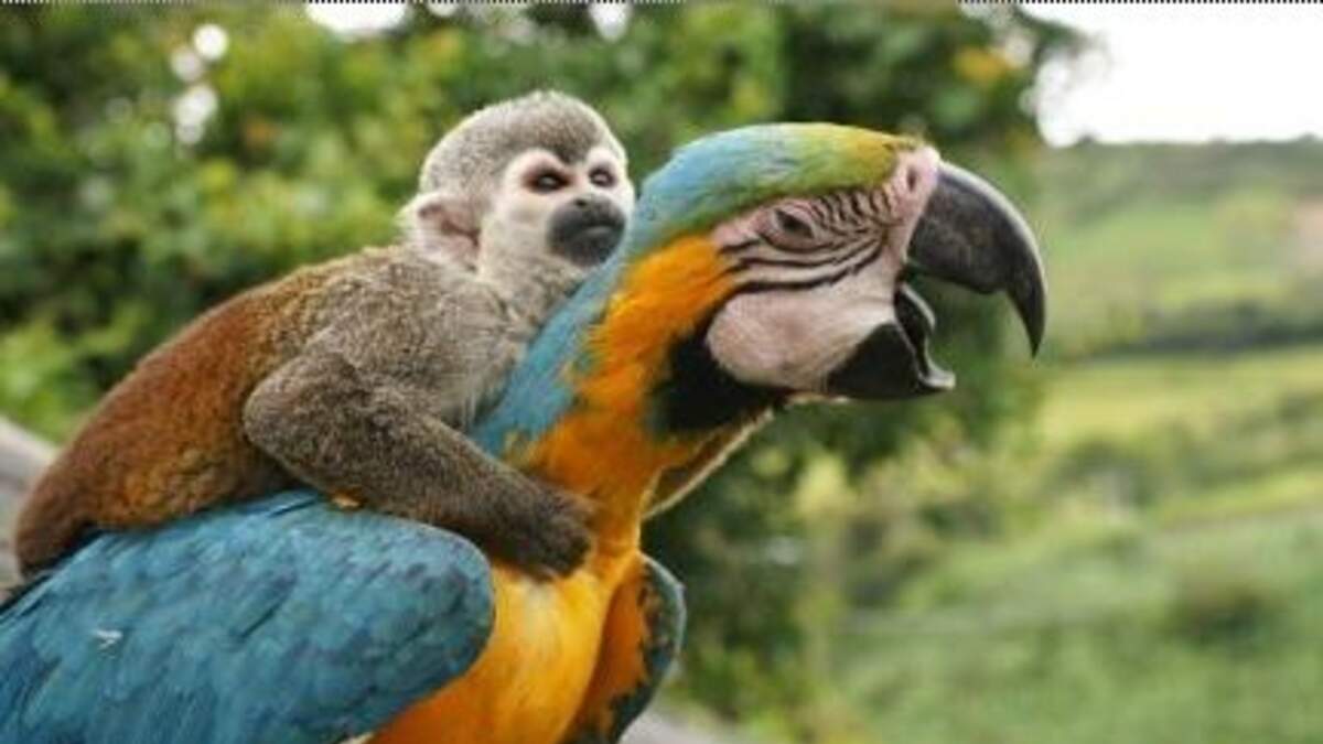At a hotel in Columbia, a squirrel monkey has found a new way of getting to tree tops, thanks to its friendship with a pair of parrots. Rather than scaling the trees, the primate simply latches on to the back of one of his airborne buddies and enjoys an easy ride. While this sort of kinship is rare in the wild, it's becoming increasingly pervasive when animals of different species are kept in captivity. More on the story here.