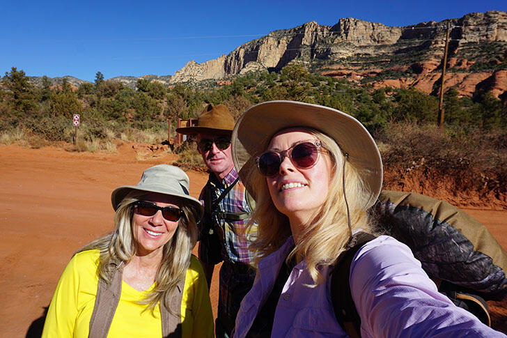 Photo 5: From left: Connie Willis, Jeremiah Horstman, and Alexandra Caldwell during a Creepy Hotspots investigation, standing in front of the wide expanse of Loy Canyon.