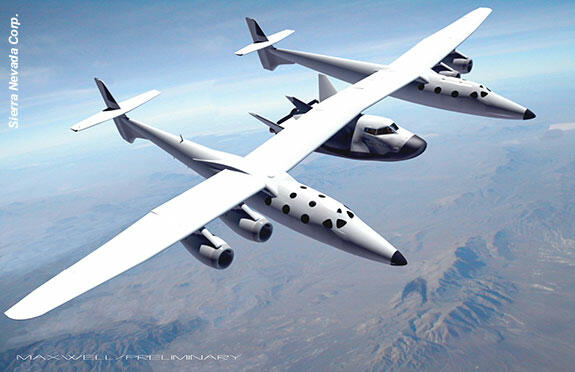 An artist's conception of Sierra Nevada's flight test vehicle and a Virgin Galactic White Knight 2 carrier aircraft during a captive carry test.