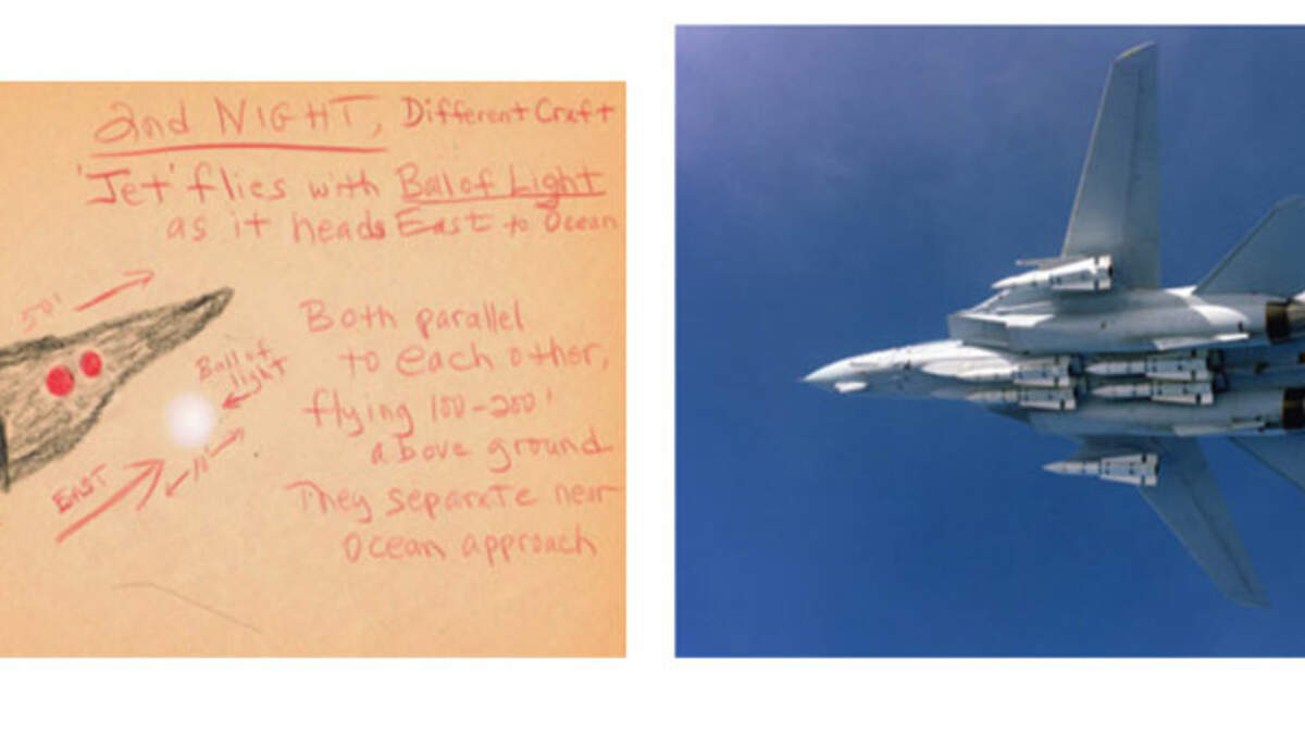 In tandem with her reports on the 4/30/15 show, Linda Moulton Howe shares this illustration. Caption: Making an abnormal, deep, bass roar "like pretending to be an (on right) F-14-type jet," a long triangular aircraft with two red, circular lights on its base and moving parallel with a ball of white light, flew low over the North Kingston, Rhode Island, house of a retired Dept. of Defense administrator on January 23, 2011. As the estimated 50-foot-long aircraft with no afterburner flew east towards Block Sound and the Atlantic Ocean, the "jet mimic" and the white ball of light separated and traveled in two different directions over the ocean. Illustration for Earthfiles by retired DoD administrator. F-14 image by USAF.
