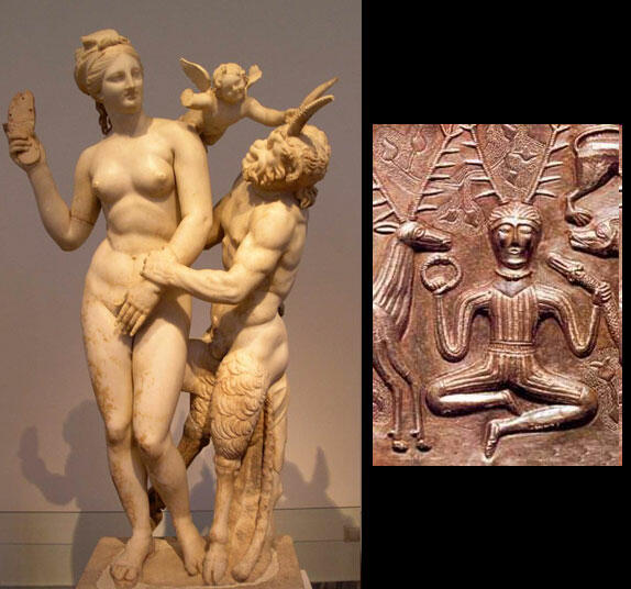 5) Herne is an ancient shamanic god of Europe and Siberia. Half deer/man. The shaman was the user of psychoactive mushrooms and other methods of inebriation or states of consciousness. He later morphed into the licentious Roman god, Pan. Pan shown trying to seduce a woman. Usually this was done with whatever alcohol or drugs he had.