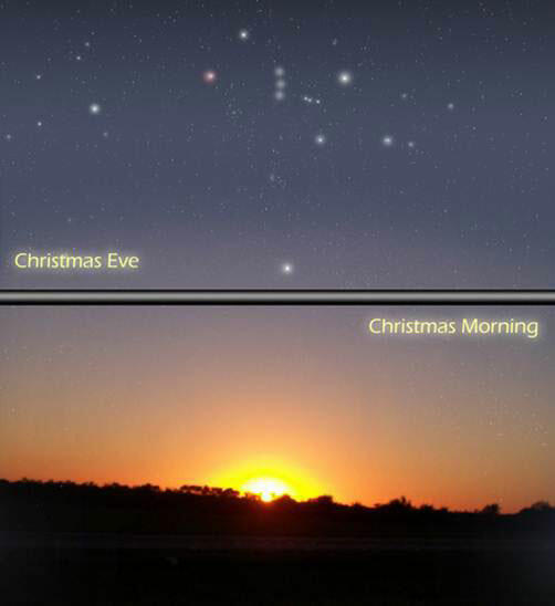 2) A split screen looking east showing the belt of Orion in alignment with Sirius on Christmas Eve, and the sun being born directly below this alignment on Christmas morning.