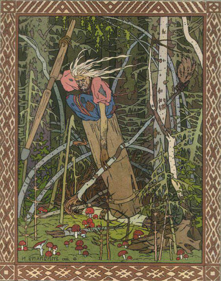 4) by Ivan Bilibin, 1899, Russia (Baba Yaga, or Grandmother Yaga, with the mushrooms)-- Baba Yaga travels and meets the three wise men. She also gives presents to children. She’s related to the witch of Hansel and Gretel.