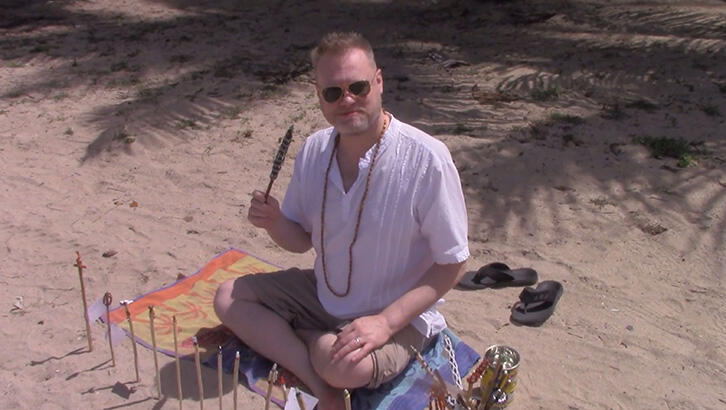 Warren "charges" wands on the beach in the Bermuda Triangle seconds before an OUFO appears overhead.
