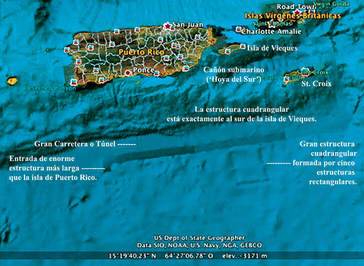 The underwater terrain near Puerto Rico shows what many believe are underwater bases of some kind. Courtesy researcher Jorge Martin.