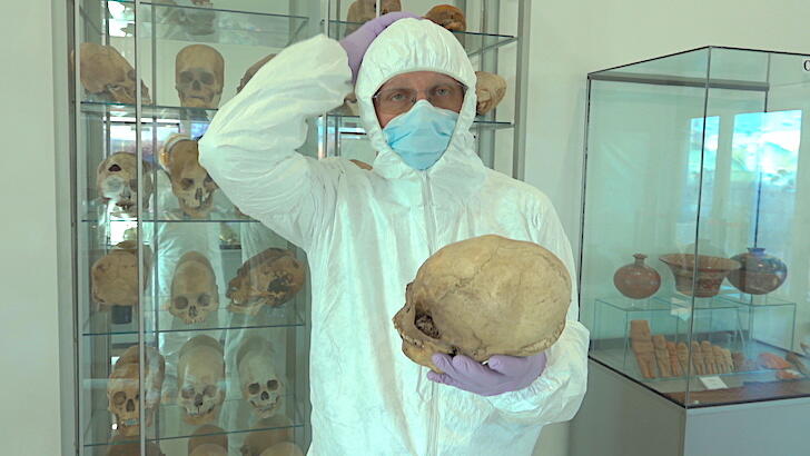L.A. holding one of the enigmatic Paracas elongated skulls at the new Paracas History Museum, Paracas, Peru.