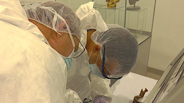 Archaeologist Mondo Gonzales and L. A. Marzulli extract samples for DNA testing.