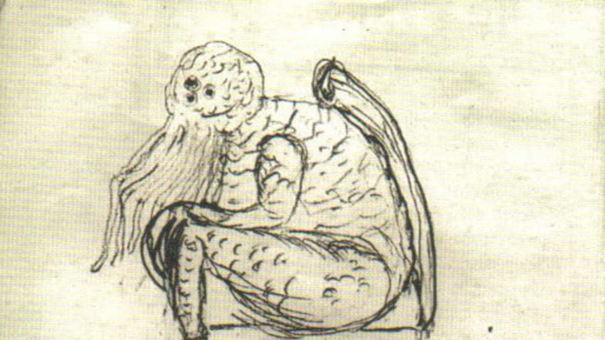 A sketch of the fictional character Cthulhu, drawn by his creator, H. P. Lovecraft in 1934. He first introduced the character-- described as part man, part dragon, and part octopus in a short story in the pulp magazine Weird Tales in 1928. An ancient evil entity, Cthulhu, has since been been featured in numerous other pop culture references and works.