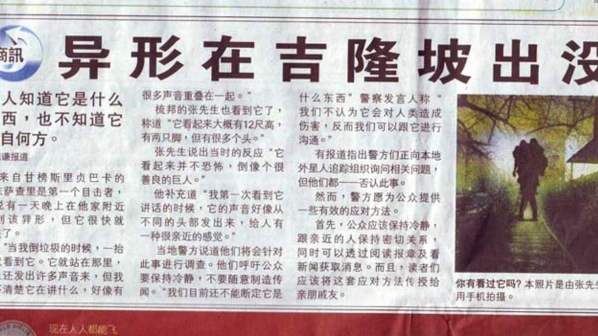 Steve Quayle forwarded us a newspaper article about a "weird figure" seen in Malaysia that appeared to be around 12 ft. tall. He received the article from a woman named Ann C. who was touring South East Asia. She writes: