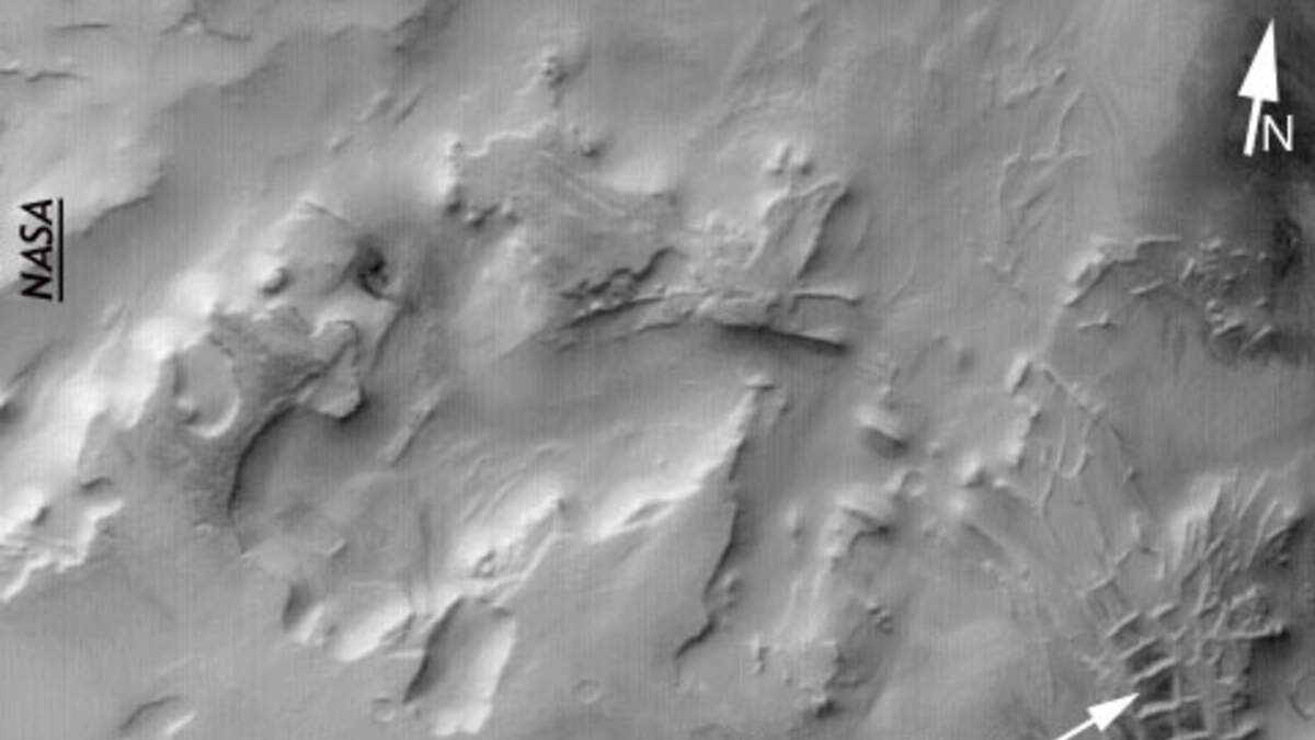 Pictured is the Martian anomaly known as "Inca City," the informal name given by Mariner 9 scientists in 1972 to a set of intersecting, rectilinear ridges that are located among the layered materials of the south polar region of Mars. Their origin has never been completely understood. The second image shows the mysterious ridges in close-up. More here.