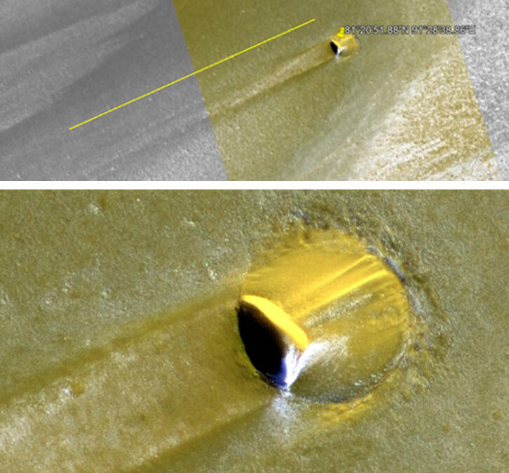 The above object appears to have skidded almost a mile across the Mars surface before slamming to a stop. The yellow line running parallel to the skid mark is 4,422 feet in length. The object itself is approximately 406 feet long and 367 feet across.
