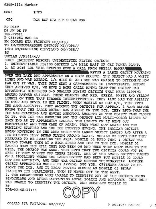 A document from the Coast Guard describing a UFO sighting near a power plant in 1988.