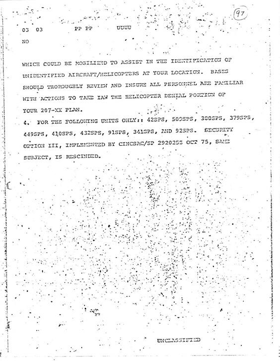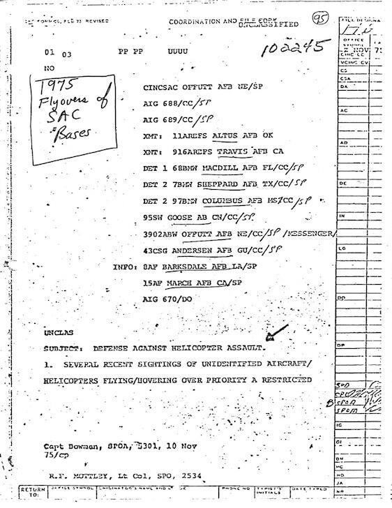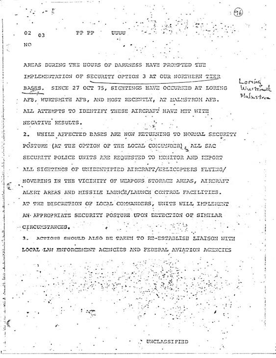 Three pages of a 1975 document reporting UFO activity over Strategic Air Command bases.