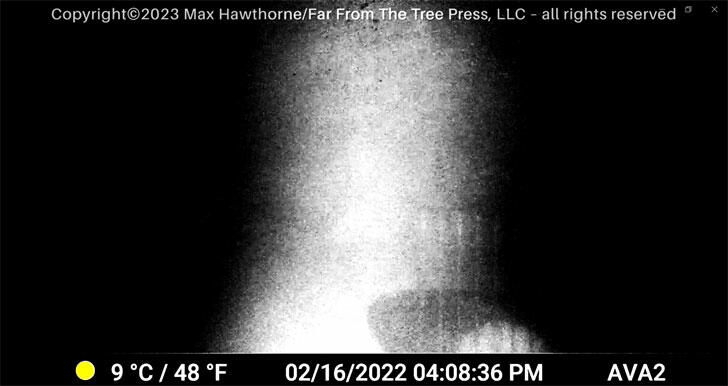 Guest on the 4/14/24 show, Max Hawthorne, shares an image of what he says may be an alien caught on his trailcam. A close-up is below. Max writes that the image "shows the entity's outline within its cloak, including his jawline."