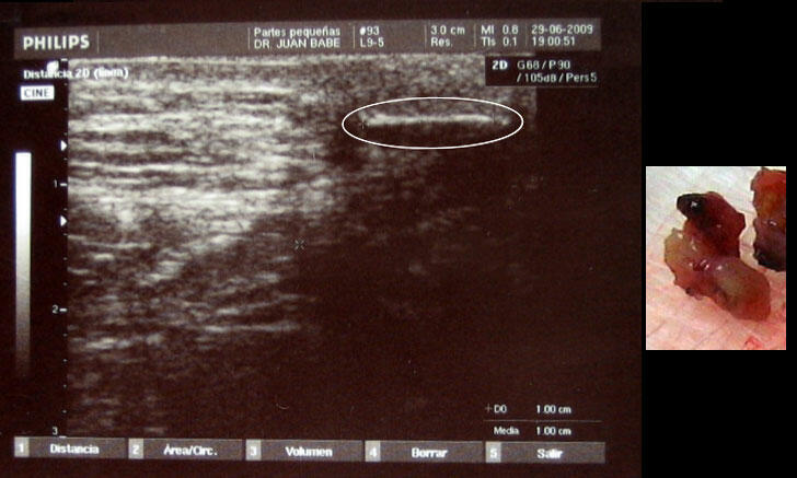 He writes: "This is an Ultrasound Image showing a foreign object believed to be a Biochip taken in Madrid, Spain. This foreign object was located beneath a small surgical incision scar in my navel."