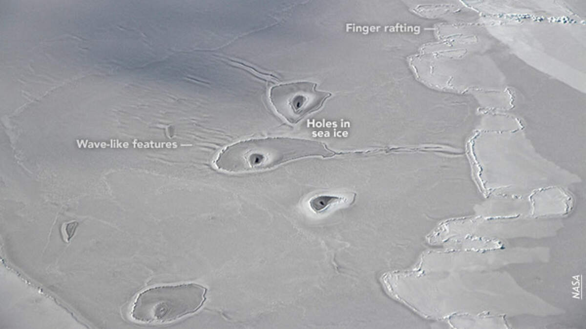 As part of NASA's IceBridge mission, an airborne survey revealed a group of mysterious ice holes in the Arctic ocean, some 50 miles northwest of Canada's Mackenzie River Delta. Mission scientist John Sonntag said the holes were something he'd never seen before. One theory is that the holes might have a mammalian origin, gnawed out by seals as a place to breathe after surfacing up from the icy waters. More on the mystery at Newsweek.