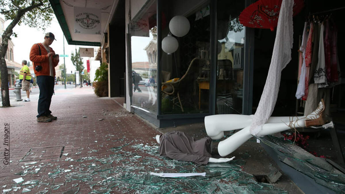 Pictured (click on image to enlarge): A mannequin lays in broken glass in front of a damaged store in Napa, California. Photo by Justin Sullivan/Getty Images.