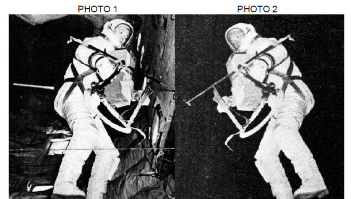 Ralph René noticed the two photographs were essentially identical- save the fact it appeared the negative had been reversed for the 'space walk' shot and background features of the interior of the aircraft blacked out. René wondered why NASA would have to fake an image of a spacewalk? And, he thought, if the Gemini record of a spacewalk is in doubt, why shouldn't the moonwalks be held to the same scrutiny?