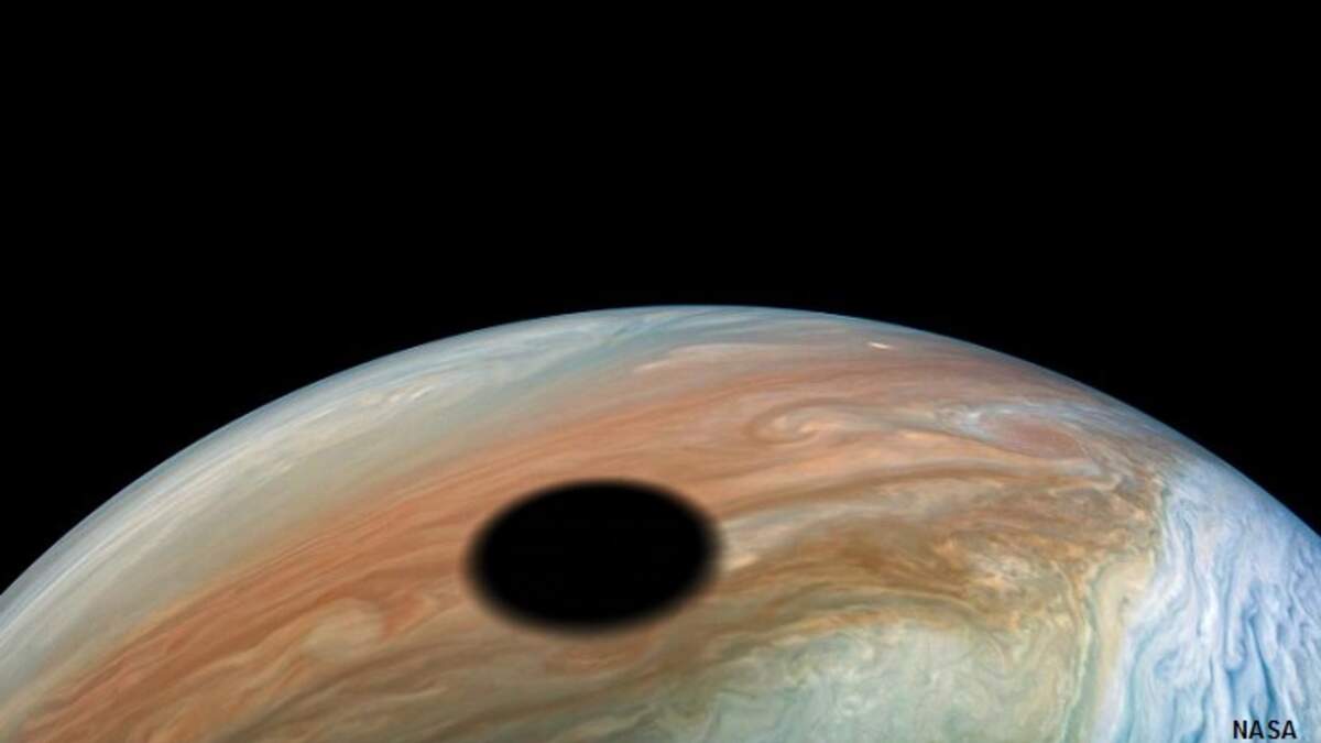 An amazing new image taken by NASA's Juno spacecraft shows the massive shadow created by one of Jupiter's moon as it passes between the planet and the sun. The breathtaking photo was reportedly snapped last week as the probe was performing one of its periodic close passes over the planet. Thanks to some fortuitous timing, it managed to catch the moment in which Jupiter's moon Io crossed in front of the sun and cast a mighty-looking shadow onto the gaseous giant.