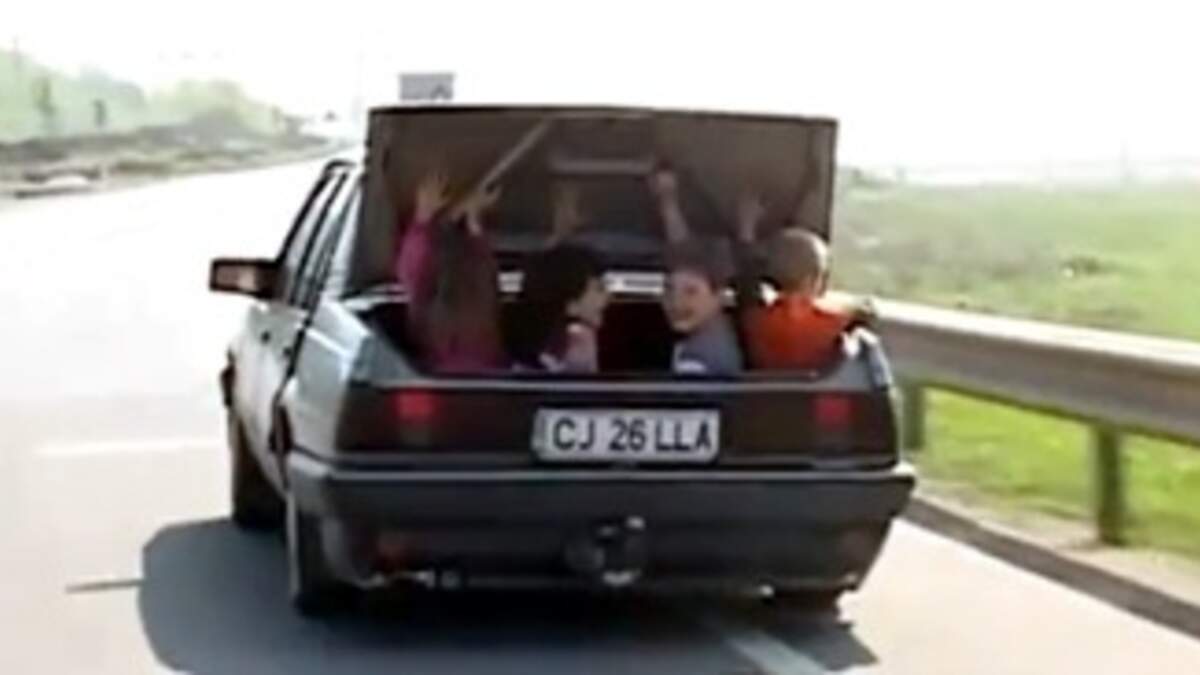 A Romanian man was arrested and fined for driving down the highway with his four children riding in the open trunk of the car. A fast thinking fellow driver noticed the bizarre sight, filmed the incident, and contacted local authorities with the footage. More on the story at Orange News.