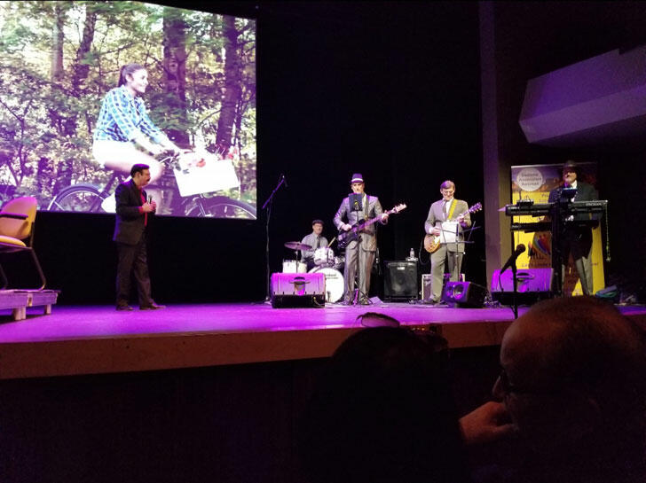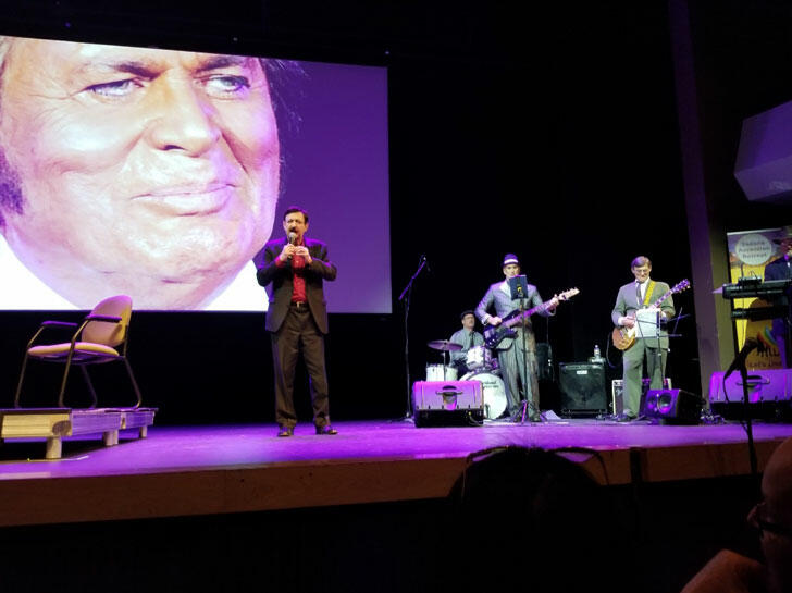 George sings the classic Engelbert Humperdinck song "Love Me With All Your Heart." (Engelbert is pictured on the screen.)