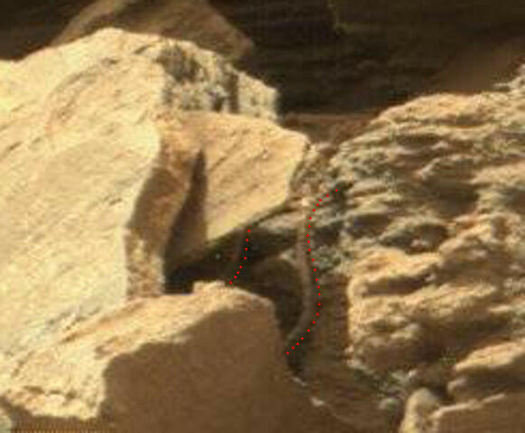 A strange curving linear thing from sol 1459, also Curiosity. Found at the base of a cliff of layered sedimentary rock.