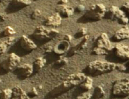 sol 1185 from Curiosity-- an odd disc with a hole and some sort of handle or stem that appears to be hollow.