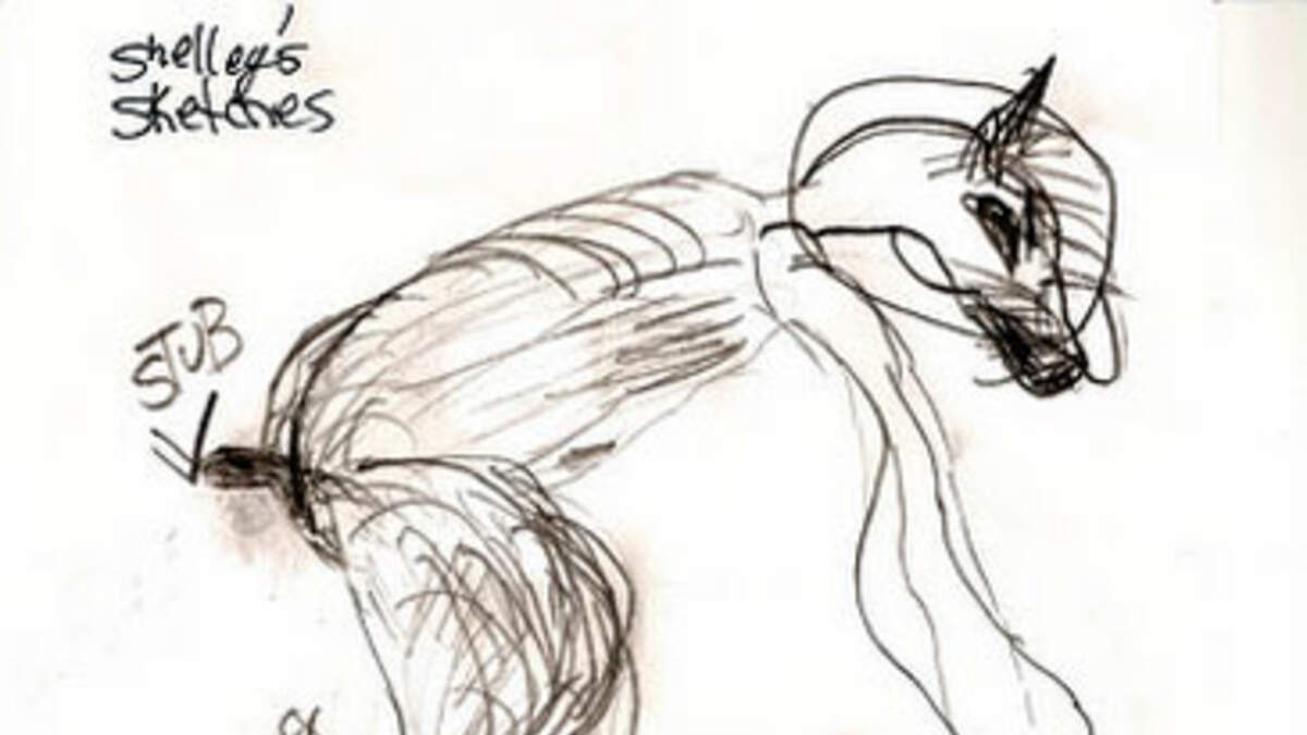 In tandem with the 10/4/12 show, Linda Godfrey shares this eyewitness sketch, representative of one of the six-to-seven-foot tall, bipedal canids that stalked Shelley and Eric Martin in their own yard near Palmyra, Maine. Reproduced with permission from Real Wolfmen: True Encounters in Modern America.