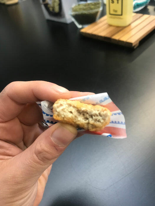 Nugget with bite - This chicken nugget was grown in a laboratory from the cloned flesh of a chicken who was still alive at the time of eating. Jenny Kleeman bit into this nugget in 2018. The company that made it, now called EatJust, have just become the first company worldwide to win regulatory approval for lab grown meat, and put it on the market in Singapore.