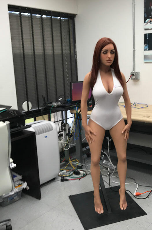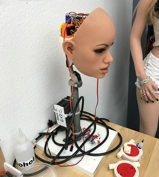 Robotic head - A prototype animatronic head in the RealBotix lab of Abyss Creations, enabled with artificial intelligence. When this is put on a RealDoll body, it becomes a sex robot.