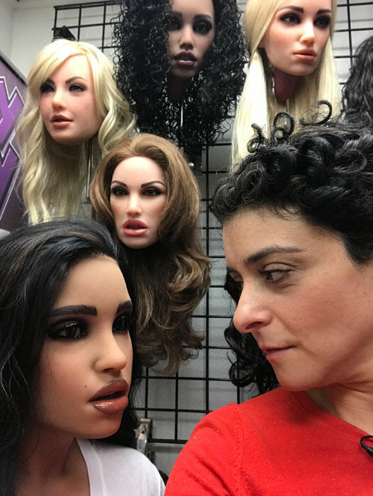 Jenny and Faces - Jenny Kleeman poses with a selection of RealDoll faces. These hyperrealistic faces are highly customizable, down to every last freckle. They are also interchangeable and snap on to the RealDoll "skull" with magnets. It's possible to buy several different face options and have different looks for the same doll body.
