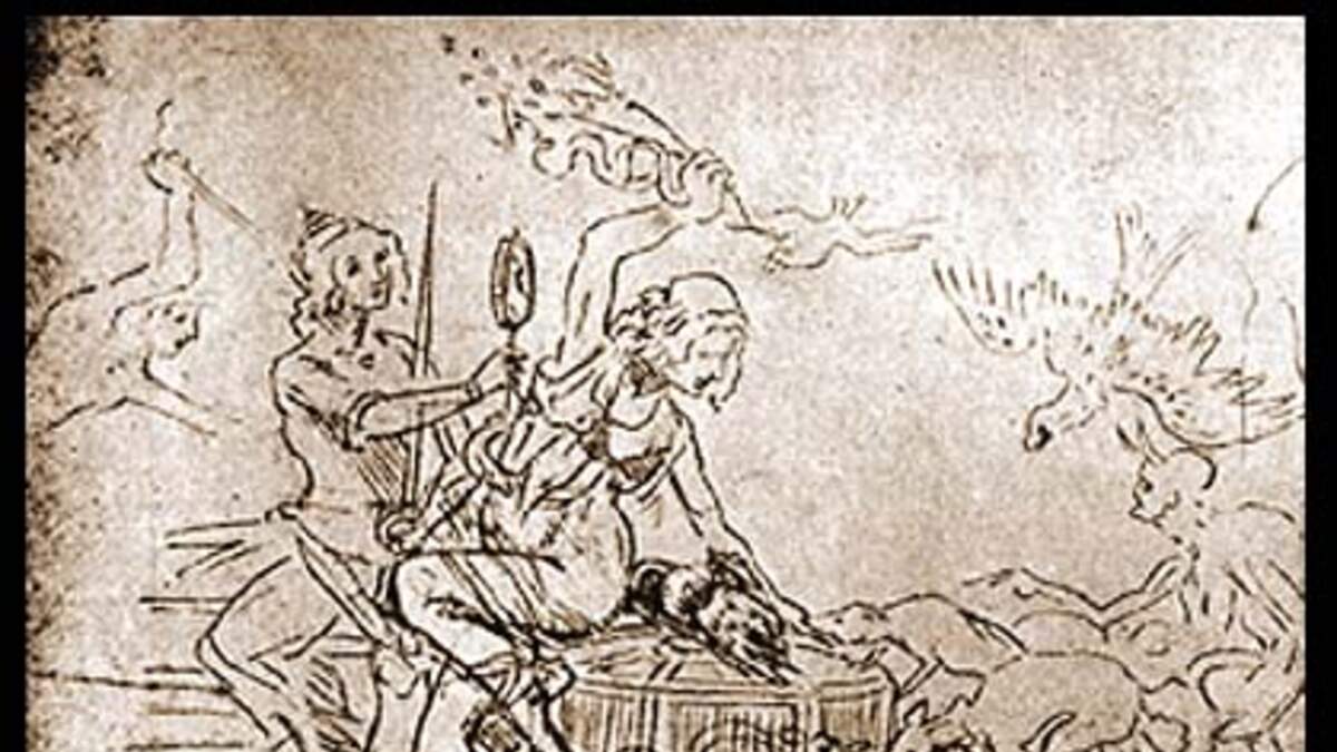 This original drawing by Leonardo da Vinci depicts a witch using a "magic mirror." The Picture Museum of Sorcery, Magic & Alchemy describes the scene, as one witch holding up the mirror for another witch, with a face of an old man in the mirror. Such "magic mirrors" were said to be used for divination, where people could be seen appearing in the mirror, performing actions that would take place in the future.