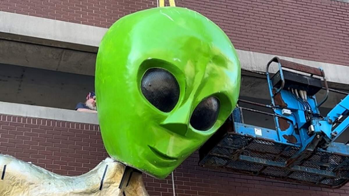 A city in Kentucky is celebrating the arrival of an eye-catching 'otherworldly visitor' in the form of a massive alien sculpture dubbed 'Clive.' According to a local media report, the rather impressive piece was recently installed in the community of Covington as part of a public art program aimed at improving the aesthetics of the city's business district. Measuring a whopping 30 feet tall, Clive peers out from the second story of a parking garage with a giant magnifying glass as if to study the cars and pedestrians who pass below. The piece was built out of fiberglass and Styrofoam by the 3D modeling company AlloyFX which worked with tourism group meetNKY to bring the 'alien' to life.